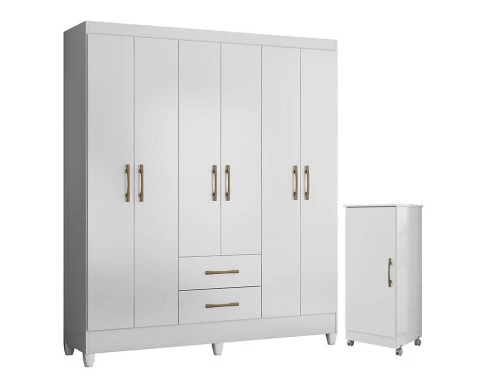 Transforme seu quarto com praticidade, estilo e o melhor custo benefício do mercado. Apresentamos o Guarda Roupa Casal Panamá e Armário Multiuso Lírio fabricados pela Moval. Guarda Roupa om 06 portas e 02 gavetas com corrediças metálicas, espaço para roupas longas, puxadores na cor bronze, cabideiro em madeira para melhor organização interna e pés em PVC. O Armário Multiuso possui uma porta com puxador na cor bronze, três prateleiras internas com ajustes de altura, proporcionando mais flexibilidade de acordo com sua necessidade, oferecendo um ótimo espaço interno para acomodar vários itens. O diferencial fica por conta dos rodízios, facilitando sua movimentação. Fabricado pela Moval, é desenvolvido em MDP de alta qualidade. Sendo a escolha ideal para quem está buscando praticidade, organização e versatilidade no dia a dia, aproveite!