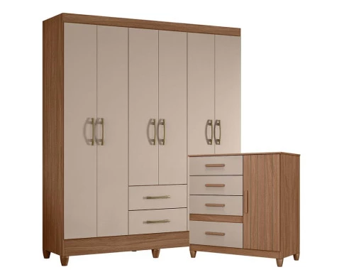 Organize seu quarto com elegância e o melhor custo beneficio do mercado. Apresentamos o Guarda Roupa Casal Panamá e Cômoda Venus fabricados pela Moval. Guarda Roupa com 06 portas e 02 gavetas com corrediças metálicas, espaço para roupas longas, puxadores na cor bronze, cabideiro em madeira para melhor organização interna e pés em PVC. A cômoda possui 04 gavetas com corrediças metálicas, 01 porta, 01 prateleira, detalhes frisados, puxadores em MDF e um design moderno que combina com qualquer decoração. Fabricado com materiais de alta qualidade que garante resistência e durabilidade ao produto. Confira mais detalhes e aproveite!