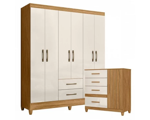 Organize seu quarto com elegância e o melhor custo beneficio do mercado. Apresentamos o Guarda Roupa Casal Panamá e Cômoda Venus fabricados pela Moval. Guarda Roupa com 06 portas e 02 gavetas com corrediças metálicas, espaço para roupas longas, puxadores na cor bronze, cabideiro em madeira para melhor organização interna e pés em PVC. A cômoda possui 04 gavetas com corrediças metálicas, 01 porta, 01 prateleira, detalhes frisados, puxadores em MDF e um design moderno que combina com qualquer decoração. Fabricado com materiais de alta qualidade que garante resistência e durabilidade ao produto. Confira mais detalhes e aproveite!