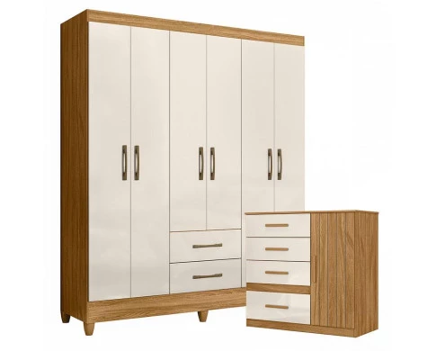 Organize seu quarto com elegância e o melhor custo beneficio do mercado. Apresentamos o Guarda Roupa Casal Panamá e Cômoda Venus fabricados pela Moval. Guarda Roupa com 06 portas e 02 gavetas com corrediças metálicas, espaço para roupas longas, puxadores na cor bronze, cabideiro em madeira para melhor organização interna e pés em PVC. A cômoda possui 04 gavetas com corrediças metálicas, 01 porta, 01 prateleira, detalhes frisados, puxadores em MDF e um design moderno que combina com qualquer decoração. Fabricado com materiais de alta qualidade que garante resistência e durabilidade ao produto. Confira mais detalhes e aproveite!