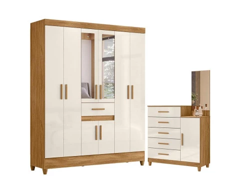 Guarda Roupa Casal Portugal com espelho e Cômoda Lisboa Freijó Off White – Moval