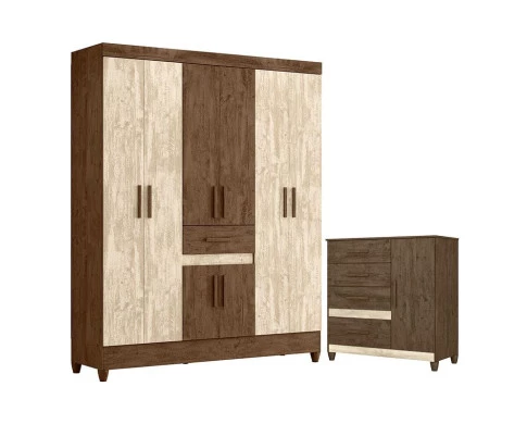 Guarda Roupa Casal Portugal e Cômoda Vênus com pés Castanho Avelã Wood – Moval