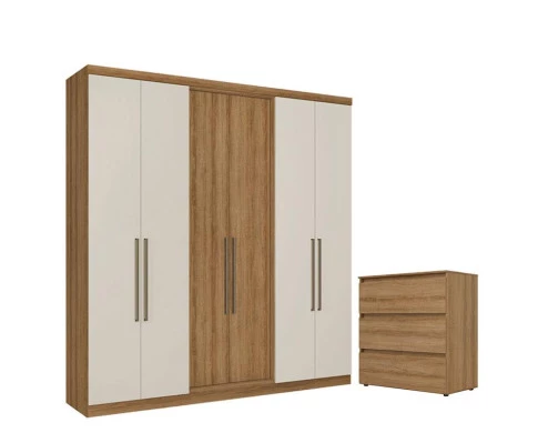 Guarda Roupa Casal Presence 6 Portas Almendra Off White e Cômoda Gaveteiro Condessa Almendra Acetinado - THB