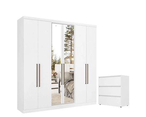 Guarda Roupa Casal Presence Full Glass 6 Portas e Cômoda Gaveteiro Condessa Branco Acetinado - THB