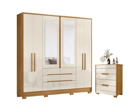 Começou a montar seu quarto? Então apresentamos para você este belo conjunto composto pelo guarda roupa da linha San Francisco e a cômoda da linha Dhara. O guarda roupa conta com seis portas, sendo as duas centrais com espelho. Com seis gavetas proporciona um espaço extra para acomodar suas roupas. Completando o conjunto, a cômoda conta com quatro gavetas. Assim como o guarda roupa, possui puxadores em MDF, corrediças telescópicas e pés em PVC, proporcionando mais estabilidade e facilitando na hora da limpeza. Fabricados pela Moval, são desenvolvidos em MDP aliando beleza, funcionalidade e resistência. Perfeito para compor seu quarto com muito estilo. Aproveite e garanta já o seu!