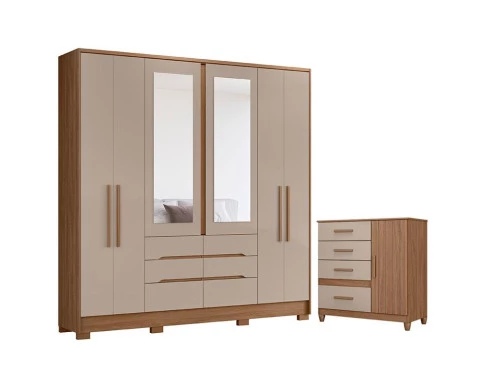 Está procurando móveis para seu quarto? Apresentamos para você este belo conjunto composto pelo guarda roupa da linha San Francisco e a cômoda da linha Vênus. Com design moderno e espaçoso, o guarda roupa possui seis portas, sendo as duas centrais com espelho. Contando com seis gavetas equipadas com corrediças telescópicas. Completando o conjunto, a cômoda possui uma porta com detalhe frisado em MDF, além de quatro gavetas com corrediças metálicas, ideal para organização de suas roupas. Assim como o guarda roupa, possui puxadores em MDF garantindo um acabamento refinado e pés em PVC . Fabricados pela Moval, são desenvolvidos em MDP de qualidade, sendo a combinação de praticidade, durabilidade e bom gosto para compor seu quarto. Aproveite e garanta já o seu!