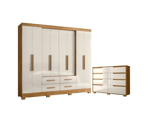 Organize seu quarto com elegância e o melhor custo benefício do mercado. Apresentamos o Guarda Roupa Casal San Lorenzo e Cômoda Georgia fabricados pela Moval. Guarda Roupa com 08 portas, portas laterais avançadas, 04 gavetas com corrediças telescópicas, puxadores na cor bronze, cabideiro e calceiros em alumínio para melhor organização interna e pés em PVC. A cômoda possui 08 gavetas com corrediças telescópicas, puxadores usinados, pés em PVC e um design moderno que combina com qualquer decoração. Fabricado com materiais de alta qualidade que garante resistência e durabilidade ao produto. Confira mais detalhes e aproveite!