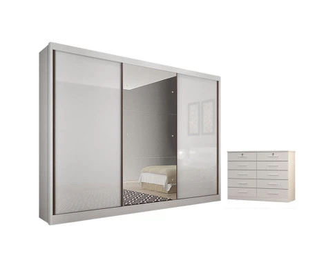 Guarda Roupa Casal Sonetto com Espelho e Gaveteiro Milão com Chave Neve - Novo Horizonte