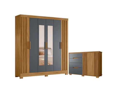 Organize seu quarto com elegância e o melhor custo benefício do mercado. Apresentamos o Guarda Roupa Casal Valença e Cômoda Texas fabricados pela Moval. Guarda Roupa possui 06 portas, sendo duas com espelhos, além de outras duas com detalhes ripados em MDF, duas gavetas equipadas com corrediças telescópicas sendo as duas internas, puxadores em MDF, cabideiros em alumínio para melhor organização interna e pés em PVC A cômoda possui 04 gavetas com corrediças telescópicas, dobradiças 35mm com amortecedor, portas com detalhes ripados, puxadores usinados e pés em PVC. Fabricado com materiais de alta qualidade que garante resistência e durabilidade ao produto. Confira mais detalhes e aproveite!
