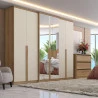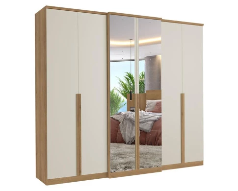 O Guarda Roupa Casal Valência 6 Portas Full Glass Capuccino Off White Acetinado - THB combina sofisticação, espaço e design moderno em um único móvel. Seu acabamento elegante em Capuccino com Off White Acetinado e as portas com espelho trazem um toque refinado que valoriza qualquer quarto. Composto por 6 portas bem distribuídas e gavetas funcionais, oferece excelente organização para roupas, calçados e acessórios. Seu amplo espaço interno conta com prateleiras, cabideiros e nichos que garantem praticidade no dia a dia e mantêm tudo sempre ao alcance.