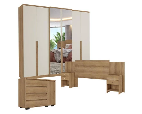 O conjunto THB reúne móveis que combinam design sofisticado, praticidade e ótimo aproveitamento de espaço. O Guarda-Roupa Casal Valência Full Glass Capuccino/Off White traz portas com detalhe em vidro, excelente organização interna e um visual moderno que valoriza o ambiente. A Cômoda com Porta Aurora complementa o quarto com gavetas amplas e uma porta versátil, oferecendo praticidade para o dia a dia. Para completar, a Cabeceira Formosa Capuccino adiciona charme, conforto e um toque acolhedor ao espaço.