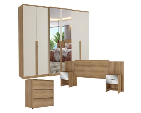 Guarda Roupa Casal Valência 6 Portas Full Glass Capuccino Off White com Cômoda Gaveteiro Condessa e Cabeceira Formosa Glass Capuccino - THB