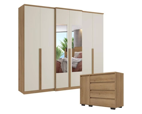 Guarda Roupa Casal Valência 6 Portas Glass Capuccino Off White com Cômoda com Porta Aurora Capuccino Acetinado - THB