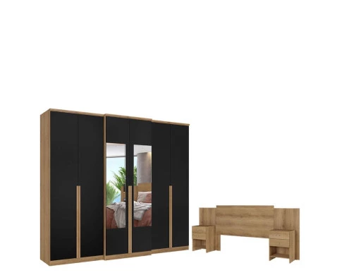 Guarda Roupa Casal Valência 6 Portas Glass Capuccino Preto Acetinado e Cabeceira com Mesas de Cabeceira Formosa Capuccino - THB