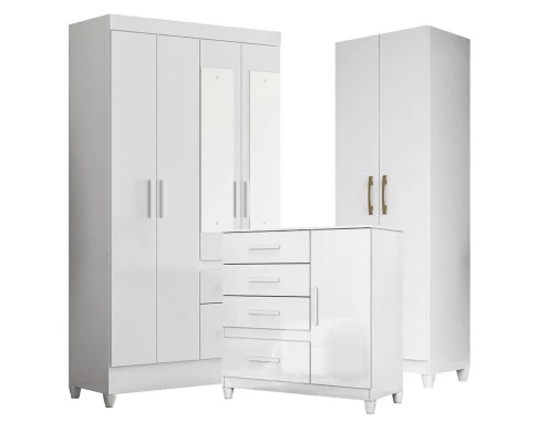 Guarda Roupa com Espelho Infantil Madri com Cômoda Vênus com pés e Armário Multiuso New Íris Branco Brilho – Moval