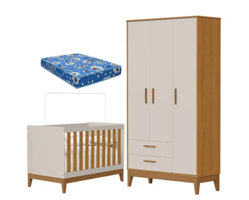 Guarda Roupa Infantil 3 Portas com Berço Americano Flip Areia Acetinado Savana com Colchão- Reller