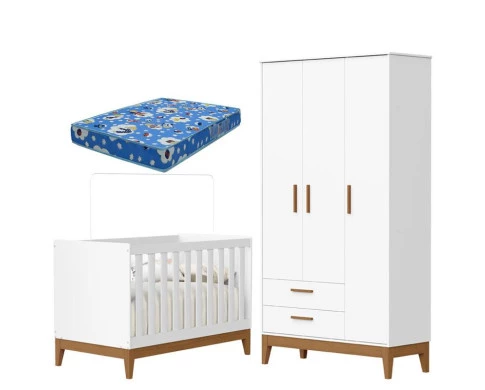 Guarda Roupa Infantil 3 Portas com Berço Americano Flip Branco Acetinado com Colchão Ortobom - Reller