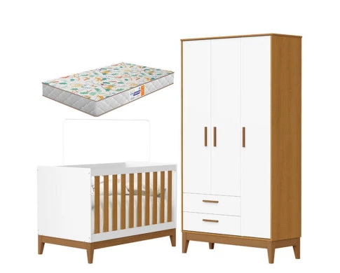 Guarda Roupa Infantil 3 Portas com Berço Americano Flip Branco Acetinado Savana com Colchão Gazin - Reller