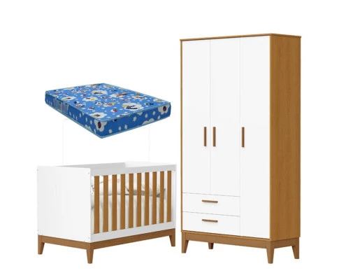 Guarda Roupa Infantil 3 Portas com Berço Americano Flip Branco Acetinado Savana com Colchão Ortobom - Reller