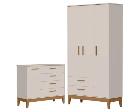 O Conjunto Infantil Flip da Reller une praticidade, organização e design moderno para o quarto do bebê ou da criança. Com acabamento em Areia acetinado, o conjunto é elegante, versátil e combina facilmente com diferentes estilos de decoração. Guarda-Roupa Infantil Flip 3 Portas projetado para manter tudo sempre no lugar, conta com cabideiro metálico para pendurar roupas, nichos internos que facilitam a organização e puxadores em MDF revestido que trazem um toque de sofisticação .Cômoda Infantil Sapateira Flip com gavetas amplas e funcionais, a cômoda é ideal para guardar roupinhas, acessórios e objetos do dia a dia. As corrediças telescópicas proporcionam abertura suave e silenciosa, enquanto os pés em madeira reforçam a estabilidade do móvel. Desenvolvido pela Reller com toda qualida de para você.