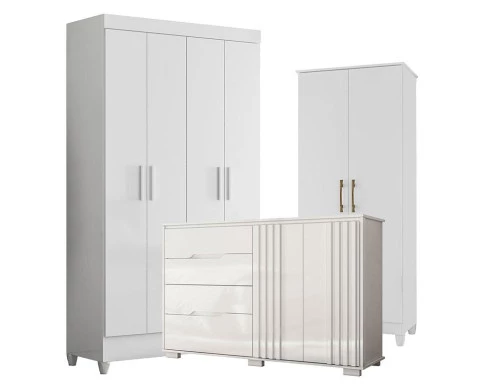 Guarda Roupa Infantil Madri com Cômoda Texas e Multiuso Jade Branco Brilho – Moval