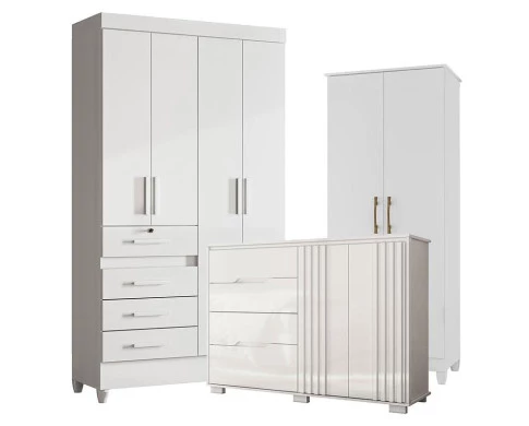 Guarda Roupa Infantil Sobral com Cômoda Texas e Armário Multiuso Jade Branco Brilho – Moval