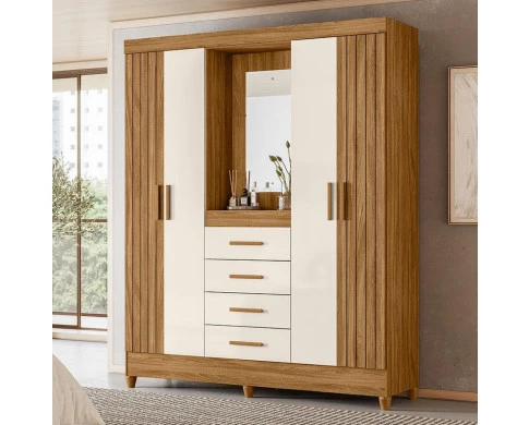 Guarda Roupa Solteiro Ambiente Atenas com Espelho 4 Portas Freijó Off White – Moval