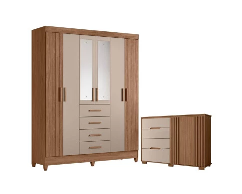 Organize seu quarto com elegância e o melhor custo benefício do mercado. Apresentamos o Guarda Roupa Solteiro Aruba e Cômoda Texas fabricados pela Moval. Guarda Roupa com 06 portas sendo 02 centrais com espelhos, 04 gavetas com corrediças metálicas, puxadores em MDF, cabideiro e calceiros em alumínio para melhor organização interna, portas com detalhes frisados, espaço ideal para roupas longas e pés em PVC. A cômoda possui 04 gavetas com corrediças telescópicas, dobradiças 35mm com amortecedor, portas com detalhes ripados, puxadores usinados e pés em PVC. Fabricado com materiais de alta qualidade que garante resistência e durabilidade ao produto. Confira mais detalhes e aproveite!