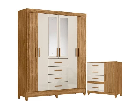 Guarda Roupa Solteiro Aruba com Espelho e Cômoda Vênus com Pés Freijó Off White – Moval