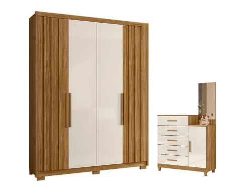 Está montando seu quarto? Apresentamos para você este belo conjunto composto pelo guarda roupa da linha Califórnia e a cômoda da linha Lisboa. O guarda roupa possui quatro portas, sendo duas com detalhes ripados em MDF. Seu diferencial está na hora da montagem das portas, com duas opções permitindo se adaptar ao seu gosto. Conta ainda com três gavetas internas equipadas com corrediças telescópicas. Complementando o conjunto, a cômoda possui uma porta, além de cinco gavetas com corrediças metálicas. O destaque é o seu painel com espelho. Tanto o guarda roupa, quanto a cômoda possuem puxadores em MDF e pés em PVC entregando mais firmeza e durabilidade. Fabricados pela Moval, são desenvolvidos em MDP de qualidade. Ideal para quartos mais compactos, aliando design moderno, praticidade e resistência. Aproveite e garanta já o seu!
