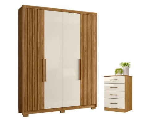 Começou a montar seu quarto? Então apresentamos para você este belo conjunto composto elo guarda roupa da linha Califórnia e a cômoda da linha MS913. O guarda roupa conta com quatro portas, sendo duas com detalhes ripados em MDF. O destaque são as duas opções na hora de montagem das portas, adaptando-se de acordo com seu gosto. Conta ainda com três gavetas internas equipadas com corrediças telescópicas, puxadores em MDF e pés em PVC. Complementando o conjunto, a cômoda possui quatro gavetas com corrediças metálicas, sendo a última maior. Seus puxadores na cor bronze agrega elegância. Fabricados pela Moval, são desenvolvidos em MDP, une beleza, praticidade e durabilidade para compor o quarto com funcionalidade e cheio de estilo. Aproveite e garanta já o seu!