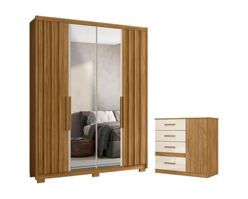 Começou a procurar móveis para seu quarto? Então apresentamos para você este belo conjunto composto pelo guarda roupa da linha Califórnia e a cômoda da linha Vênus. O guarda roupa possui quatro portas, sendo as duas centrais com espelho. Internamente, conta com três gavetas equipadas com corrediças e pés em PVC entregando mais estabilidade e resistência. A cômoda complementa o conjunto, dispondo de quatro gavetas com corrediças metálicas e uma porta com detalhes frisados. Assim como o guarda roupa, a cômoda possui puxadores em MDF. Fabricados pela Moval, são desenvolvidos em MDP, sendo a escolha perfeita para quem procura um ótimo espaço interno com acabamentos refinados e materiais de alta qualidade. Aproveite e garanta já o seu!