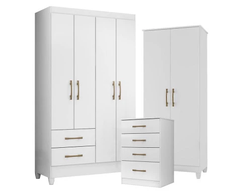 Guarda Roupa Solteiro Chile com Cômoda MS913 e Armário Multiuso Jade Branco Brilho– Moval