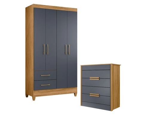 Organize seu quarto com elegância e o melhor custo benefício do mercado. Apresentamos o Guarda Roupa Solteiro Chile e Cômoda Dhara fabricados pela Moval. Guarda Roupa com 04 portas e 02 gavetas com corrediças metálicas, puxadores na cor bronze, cabideiro em madeira para melhor organização interna, espaço ideal para roupas longas e pés em PVC. A cômoda possui 04 gavetas com corrediças telescópicas, moldura lateral de 25mm, tampo de 15mm, puxadores em MDF, pés em PVC e um design moderno que combina com qualquer decoração. Fabricado com materiais de alta qualidade que garante resistência e durabilidade ao produto. Confira mais detalhes e aproveite!