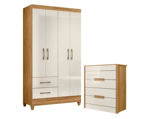 Organize seu quarto com elegância e o melhor custo benefício do mercado. Apresentamos o Guarda Roupa Solteiro Chile e Cômoda Dhara fabricados pela Moval. Guarda Roupa com 04 portas e 02 gavetas com corrediças metálicas, puxadores na cor bronze, cabideiro em madeira para melhor organização interna, espaço ideal para roupas longas e pés em PVC. A cômoda possui 04 gavetas com corrediças telescópicas, moldura lateral de 25mm, tampo de 15mm, puxadores em MDF, pés em PVC e um design moderno que combina com qualquer decoração. Fabricado com materiais de alta qualidade que garante resistência e durabilidade ao produto. Confira mais detalhes e aproveite!