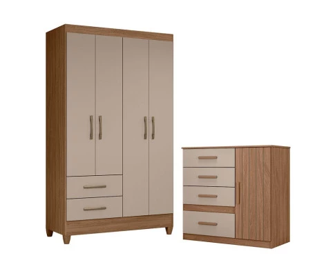 Organize seu quarto com elegância e o melhor custo benefício do mercado. Apresentamos o Guarda Roupa Solteiro Chile e Cômoda Vênus fabricados pela Moval. Guarda Roupa com 04 portas e 02 gavetas com corrediças metálicas, puxadores na cor bronze, cabideiro em madeira para melhor organização interna, espaço ideal para roupas longas e pés em PVC. A cômoda possui 04 gavetas com corrediças metálicas, 01 porta com detalhe frisado, puxadores em MDF na cor bronze e um design moderno que combina com qualquer decoração. Fabricado com materiais de alta qualidade que garante resistência e durabilidade ao produto. Confira mais detalhes e aproveite!