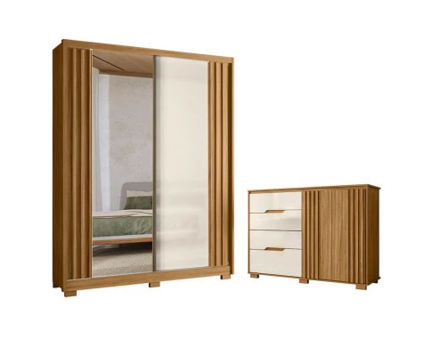 Começou a procurar móveis para seu quarto? Então apresentamos para você este belo conjunto composto pelo guarda roupa da linha Colorado e a cômoda da linha Texas. O guarda roupa conta com duas portas, sendo uma delas com espelho. Internamente oferece três gavetas com excelente organização. A cômoda complementa o visual. Possui duas portas, além de quatro gavetas. Assim como o guarda roupa, a cômoda possui detalhes ripados, corrediças telescópicas e pés em PVC. Fabricados pela Moval, são desenvolvidos em MDP, ideal para quem busca qualidade, design moderno e praticidade para compor o quarto. Aproveite e garanta já o seu!