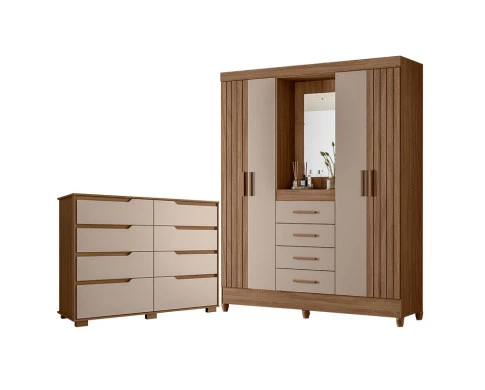 Organize seu quarto com elegância e o melhor custo benefício do mercado. Apresentamos o Guarda Roupa Solteiro Atenas e Cômoda Georgia fabricados pela Moval. Guarda Roupa possui quatro portas, quatro gavetas equipadas com corrediças metálicas, modelo com capelinha central com espelho, destacando o visual refinado e moderno, puxadores em MDF, cabideiros em alumínio para melhor organização interna e pés em PVC. A cômoda possui 08 gavetas com corrediças telescópicas, puxadores usinados e pés em PVC. Fabricado com materiais de alta qualidade que garante resistência e durabilidade ao produto. Confira mais detalhes e aproveite!