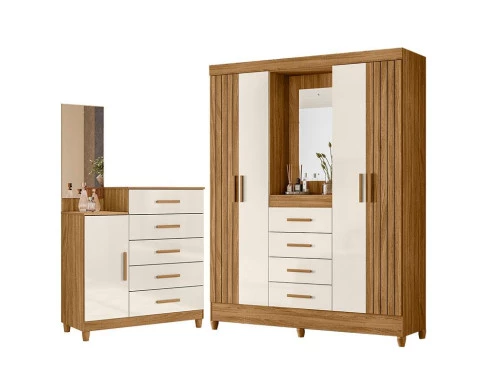 Guarda Roupa Solteiro com Espelho Atenas e Cômoda Lisboa Freijó Off White – Moval