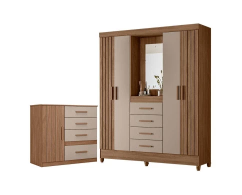 Organize seu quarto com elegância e o melhor custo benefício do mercado. Apresentamos o Guarda Roupa Solteiro Atenas e Cômoda Vênus fabricados pela Moval. Guarda Roupa possui quatro portas, quatro gavetas equipadas com corrediças metálicas, modelo com capelinha central com espelho, destacando o visual refinado e moderno, puxadores em MDF, cabideiros em alumínio para melhor organização interna e pés em PVC. A cômoda possui 04 gavetas com corrediças metálicas, 01 porta com detalhes frisados e puxadores em MDF. Fabricado com materiais de alta qualidade que garante resistência e durabilidade ao produto. Confira mais detalhes e aproveite!