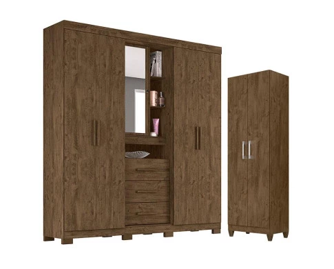 Transforme seu quarto com praticidade, estilo e o melhor custo beneficio do mercado. Apresentamos o Guarda Roupa Solteiro Eldorado e Armário Multiuso New Íris fabricados pela Moval. Guarda Roupa possui 05 portas e 03 gavetas com corrediças metálicas, portas laterais avançadas, porta objetos com espelho e chave, puxadores em MDF, cabideiros e calceiros em alumínio para melhor organização interna e pés em PVC. O Armário Multiuso possui 02 portas, quatro prateleiras internas, cantoneira metálica para fixação na parede, puxadores na cor bronze, pés em PVC e um design moderno que combina com qualquer decoração. Fabricado com materiais de alta qualidade que garante resistência e durabilidade ao produto. Confira mais detalhes e aproveite!
