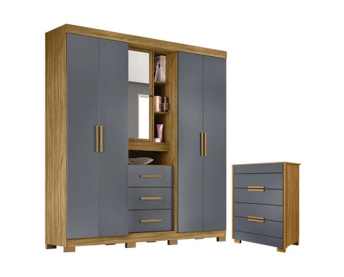 Organize seu quarto com elegância e o melhor custo benefício do mercado. Apresentamos o Guarda Roupa Solteiro Eldorado e Cômoda Dhara fabricados pela Moval. Guarda Roupa com 05 portas e 03 gavetas com corrediças metálicas, portas laterais avançadas, porta objetos com espelho e chave, puxadores em MDF, cabideiros e calceiros em alumínio para melhor organização interna e pés em PVC. A cômoda possui 04 gavetas com corrediças telescópicas, moldura lateral de 25mm e tampo de 15mm, puxadores na cor bronze e pés em PVC. Fabricado com materiais de alta qualidade que garante resistência e durabilidade ao produto. Confira mais detalhes e aproveite! Características Técnicas: