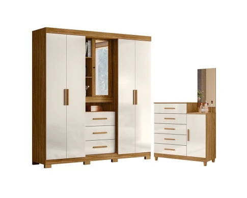 Organize seu quarto com elegância e o melhor custo benefício do mercado. Apresentamos o Guarda Roupa Solteiro Eldorado e Cômoda Lisboa fabricados pela Moval. Guarda Roupa com 05 portas e 03 gavetas com corrediças metálicas, portas laterais avançadas, porta objetos com espelho e chave, puxadores em MDF, cabideiros e calceiros em alumínio para melhor organização interna e pés em PVC. A cômoda possui 05 gavetas com corrediças metálicas, painel com espelho, 01 porta, puxadores em MDF e pés em PVC. Fabricado com materiais de alta qualidade que garante resistência e durabilidade ao produto. Confira mais detalhes e aproveite! Características Técnicas: