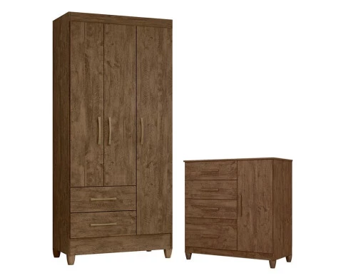 Guarda Roupa Solteiro Lima e Cômoda Vênus com Pés Castanho Wood Flex – Moval
