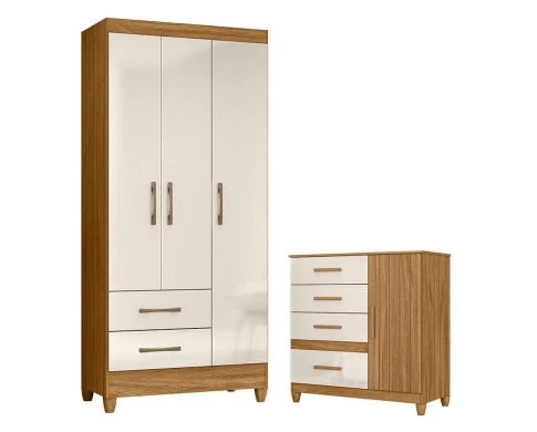 Guarda Roupa Solteiro Lima e Cômoda Vênus com Pés Freijó Off White – Moval