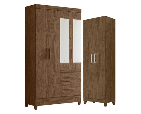Transforme seu quarto com praticidade, estilo e o melhor custo beneficio do mercado. Apresentamos o Guarda Roupa Solteiro Madri e Armário Multiuso New Íris fabricados pela Moval. Guarda Roupa 04 portas sendo duas com espelho, 02 gavetas com corrediças metálicas, puxadores em MDF, cabideiros em alumínio para melhor organização interna e pés em PVC. O Armário Multiuso possui 02 portas, quatro prateleiras internas, cantoneira metálica para fixação na parede, puxadores na cor bronze, pés em PVC e um design moderno que combina com qualquer decoração. Fabricado com materiais de alta qualidade que garante resistência e durabilidade ao produto. Confira mais detalhes e aproveite!