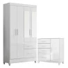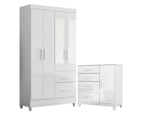 Guarda Roupa Solteiro Madri com espelho e Cômoda Vênus com pés Branco Flex – Moval