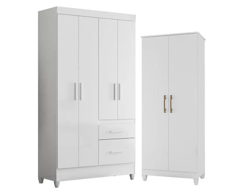 Guarda Roupa Solteiro Madri e Armário Multiuso Jade Branco Brilho – Moval