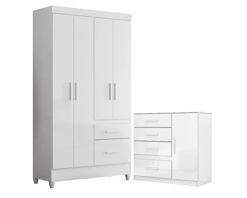Organize seu quarto com elegância e o melhor custo benefício do mercado. Apresentamos o Guarda Roupa Solteiro Madri e Cômoda Vênus fabricados pela Moval. Guarda Roupa possui 04 portas, 02 gavetas com corrediças metálicas, puxadores em MDF, cabideiros em alumínio para melhor organização interna e pés em PVC. A cômoda possui 04 gavetas com corrediças metálicas, 01 porta com detalhe frisado e puxadores em MDF. Fabricado com materiais de alta qualidade que garante resistência e durabilidade ao produto. Confira mais detalhes e aproveite!