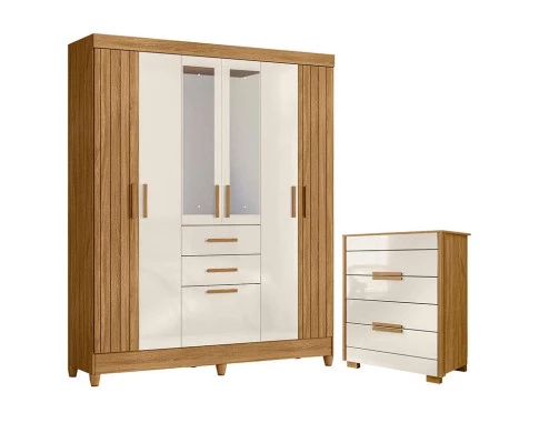 Guarda Roupa Solteiro Malta com Espelho e Cômoda Dhara Freijó Off White – Moval